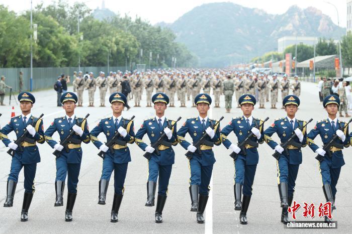 即将举行反日战争和世界反法西斯战争80周年的纪念。最近,在位于北京的军事游行训练地点,进行了军事游行训练。照片由中国新闻服务记者江齐·齐明(Jiang Qiming)